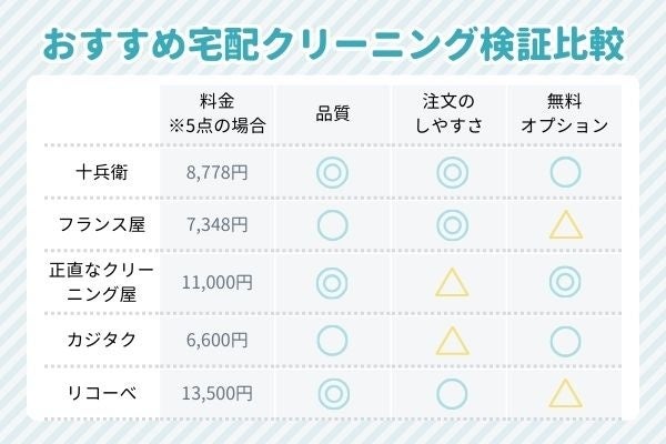 結果として、「料金の安さ」「品質」「注文のしやすさ」「無料オプションの数」全てを兼ね揃えた宅配クリーニング業者は正直なところありません。