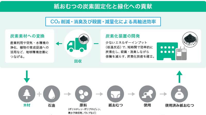 *1 使用済み紙おむつが燃やされる際にはCO2が発生するが、炭素化の場合は炭化物に炭素が固定化されるため、発生するCO2を削減することができ、環境負荷低減につながる