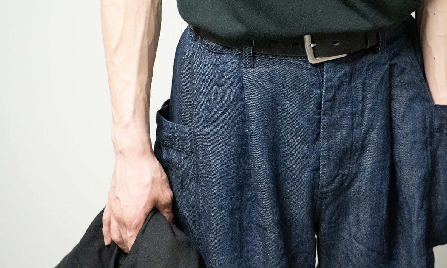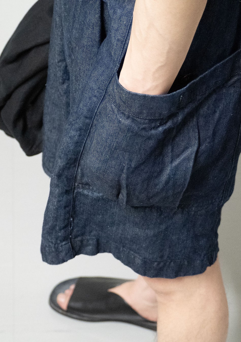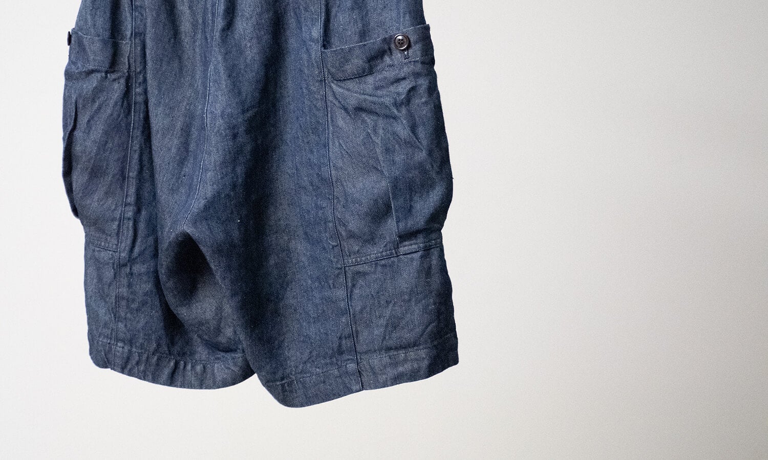 節や凹凸が多い糸質により扱いの難しいリネンを厚地に織り上げたリネンデニム。インディゴ染めされた経(たて)糸は、洗い込むことで色落ちしますが、それによって奥行きのある濃度さが生まれます。