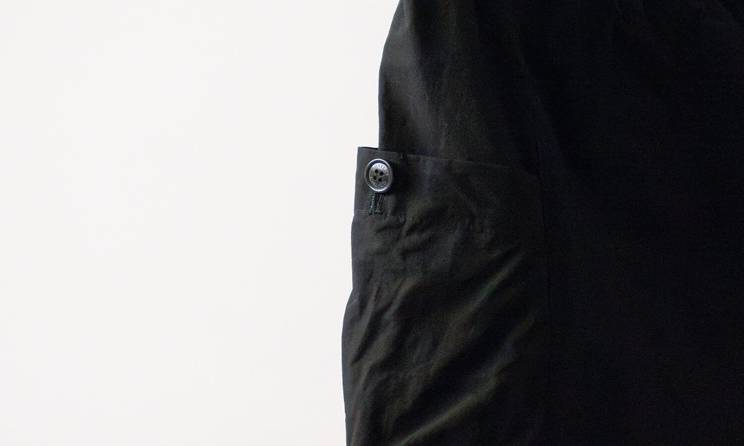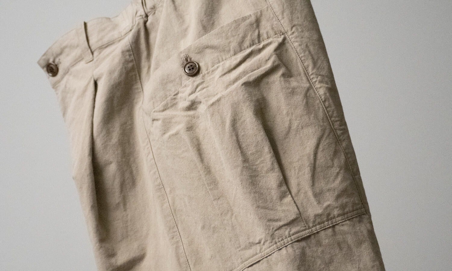 高密度に織り上げたコットンリネンの平織り生地を、そのまま洗い解し、柔らかく晒したファブリックです。タックの入ったポケットは膨らみ、全体的に横広なシルエットになります。