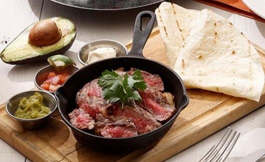 テクス・メクスの代表料理"ファヒータ"をロイヤルガーデンカフェ風にアレンジ。グリルしたアンガスビーフと季節野菜を、ワカモレ、サルサ、サワークリームをのせてトルティーヤで包んでお召し上がりください。