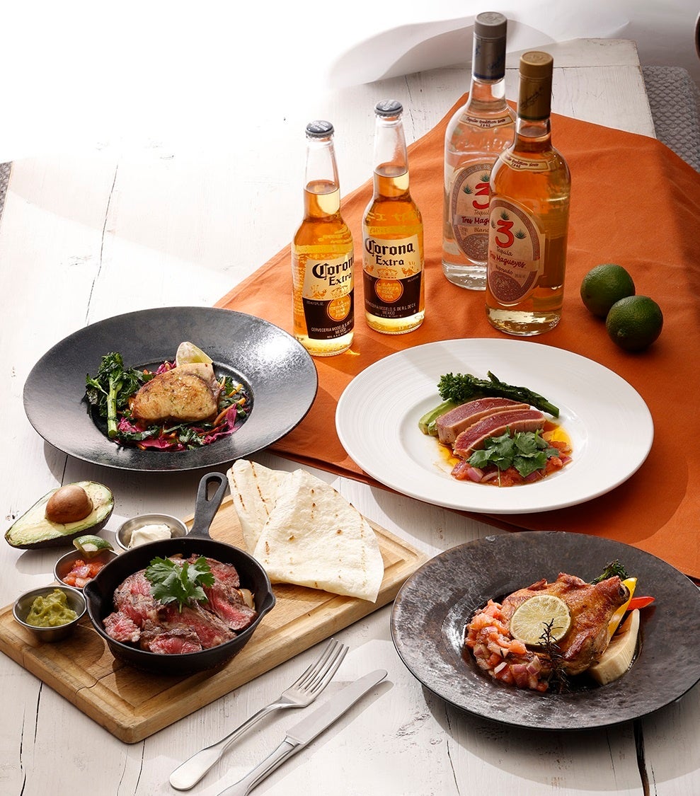 本企画では、香ばしくグリルしたビーフ、骨付きチキン、カジキマグロなどを、たっぷりの野菜とピリ辛サルサソースやライムで風味豊かにお楽しみいただける「アンガスビーフと季節野菜のファヒータ」、「骨付きチキンと季節野菜のグリル ライムサルサソース」、「メカジキのグリル テクス・メクスコールスローを添えて」や、テクス・メクスの中にもほんのり和テイストを感じる「マグロのレアステーキ サルサソースとレホール醤油」など、ロイヤルガーデンカフェらしいアレンジが効いた計4品をご用意しました。