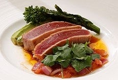 マグロの表面をさっと焼き、中はレアに仕上げました。ピリ辛のサルサソースとレホール醤油がよく合い絶妙な味わいです。