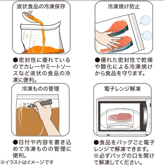冷凍・解凍にも対応している、密閉度が優れたダブルジッパータイプ。具材をカットして冷凍しておけば、使いたいときに包丁いらずでサッと使えて便利です。節約志向が高まっている中、フリーザーバッグで冷凍保存すれば「捨てない生活」として食品ロスにも貢献します。