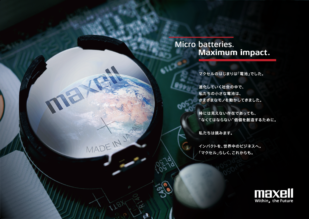 この一言には、マクセルの社名の由来にもある「小さな電池が大きな価値を生み出す」という姿勢と、未来の社会に対して果たすべき役割を凝縮しています。「マイクロサイズの電池が、世界の産業を支える大きなインパクトを生む」という、マクセルの中心に位置する電池事業を象徴として表現しています。