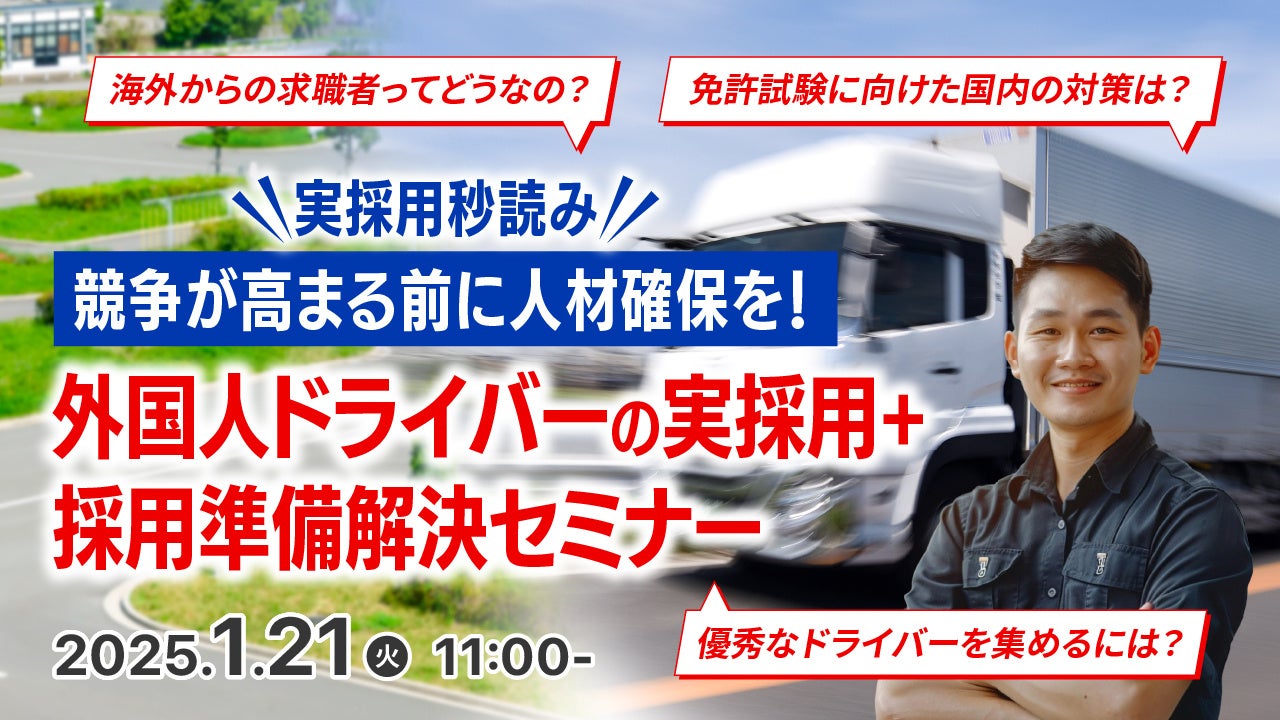 「働く」に関する社会課題をビジネスで解決するキャムコムグループの株式会社天職市場(本社:東京都新宿区、代表取締役:春名敬太 、以下:天職市場)は、2025年1月21日(火) 11:00よりオンラインセミナー『外国人ドライバーの実採用+採用準備解決セミナー』を開催いたします。