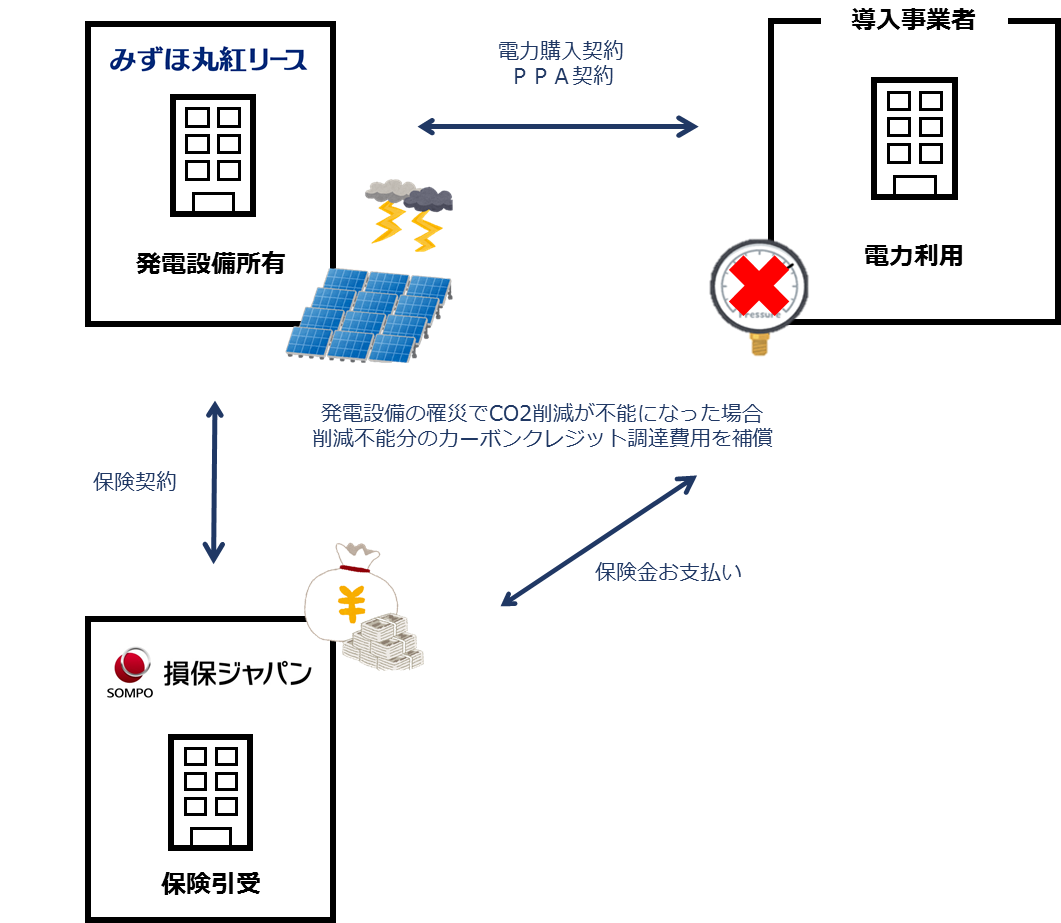 みずほ丸紅リースが保有する太陽光発電PPA物件に対して、損保ジャパンがCO2削減不能時のカーボンクレジット調達費用を補償する保険を提供する仕組みによりサービスを提供します。