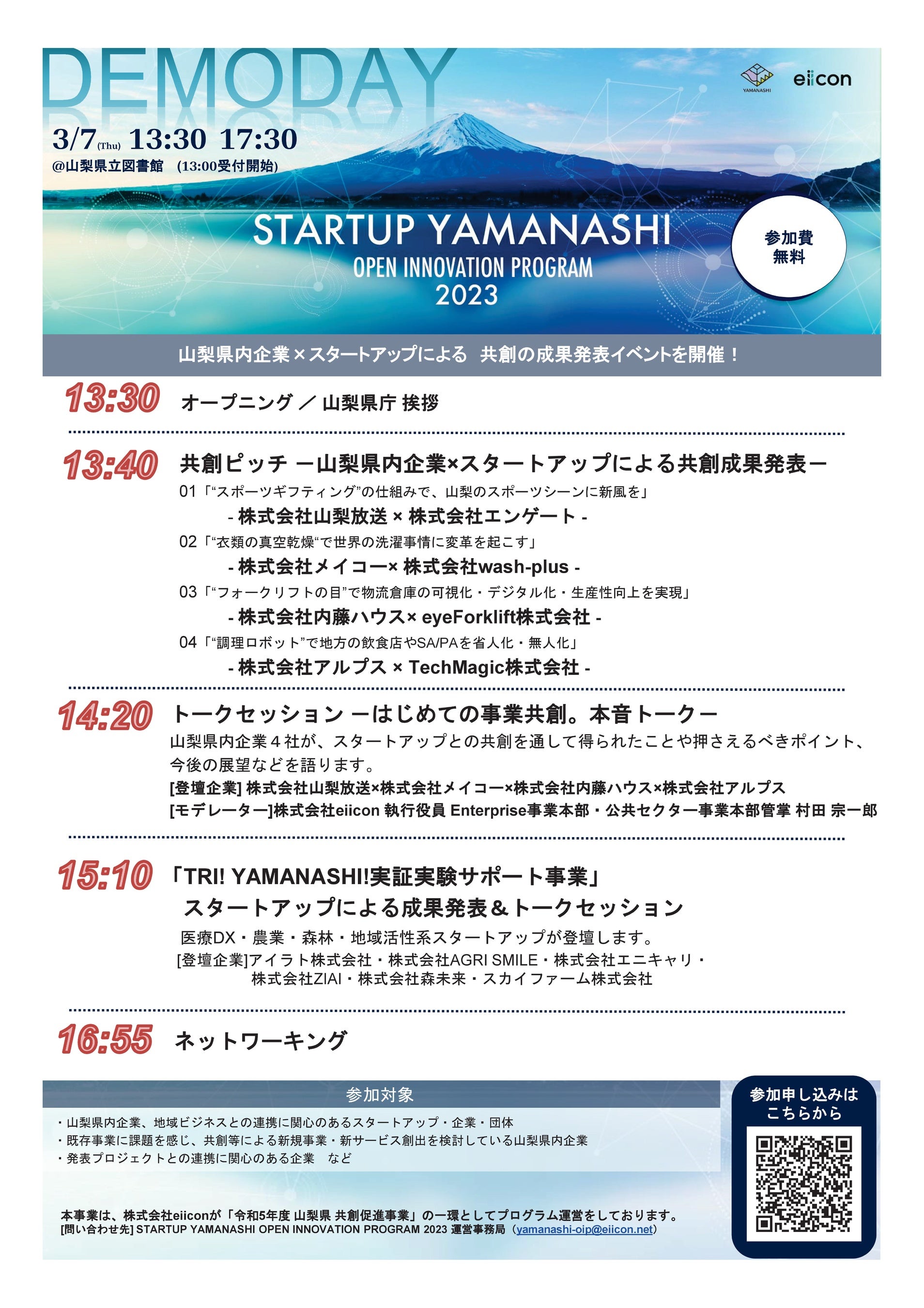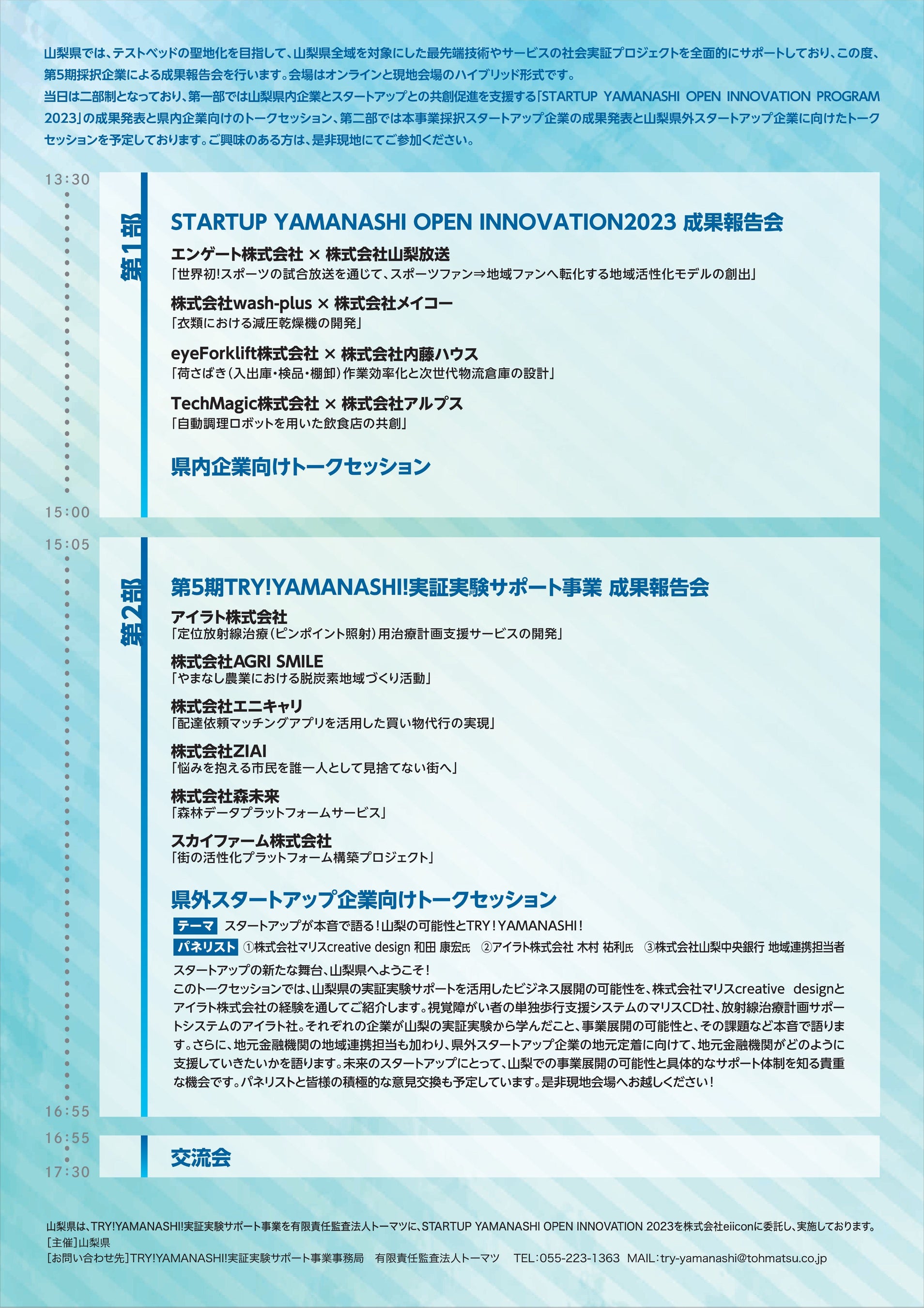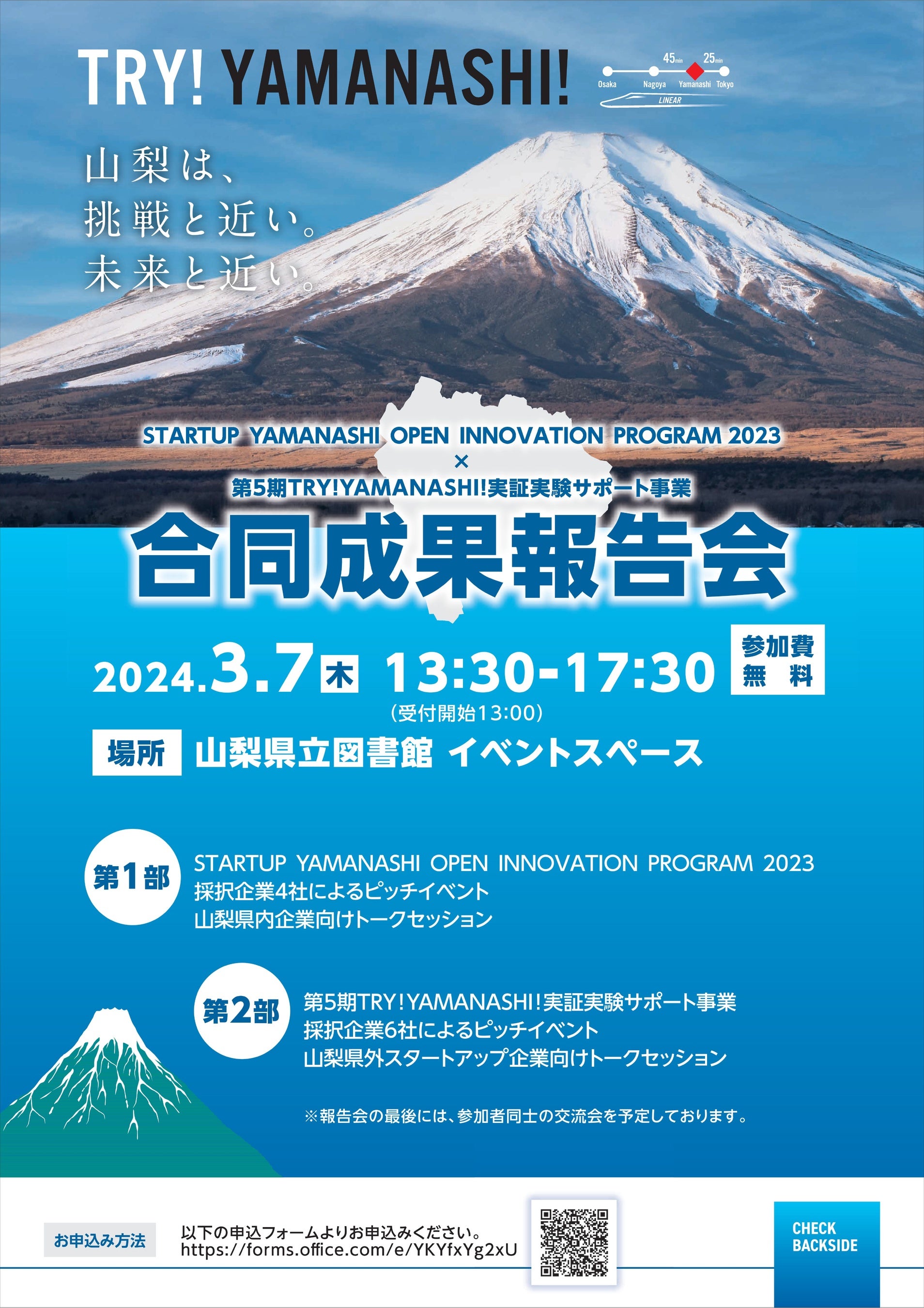 合同成果発表会(「STARTUP YAMANASHI OPEN INNOVATION PROGRAM 2023」「第5期TRY!YAMANASHI!実証実験サポート事業」)を開催します