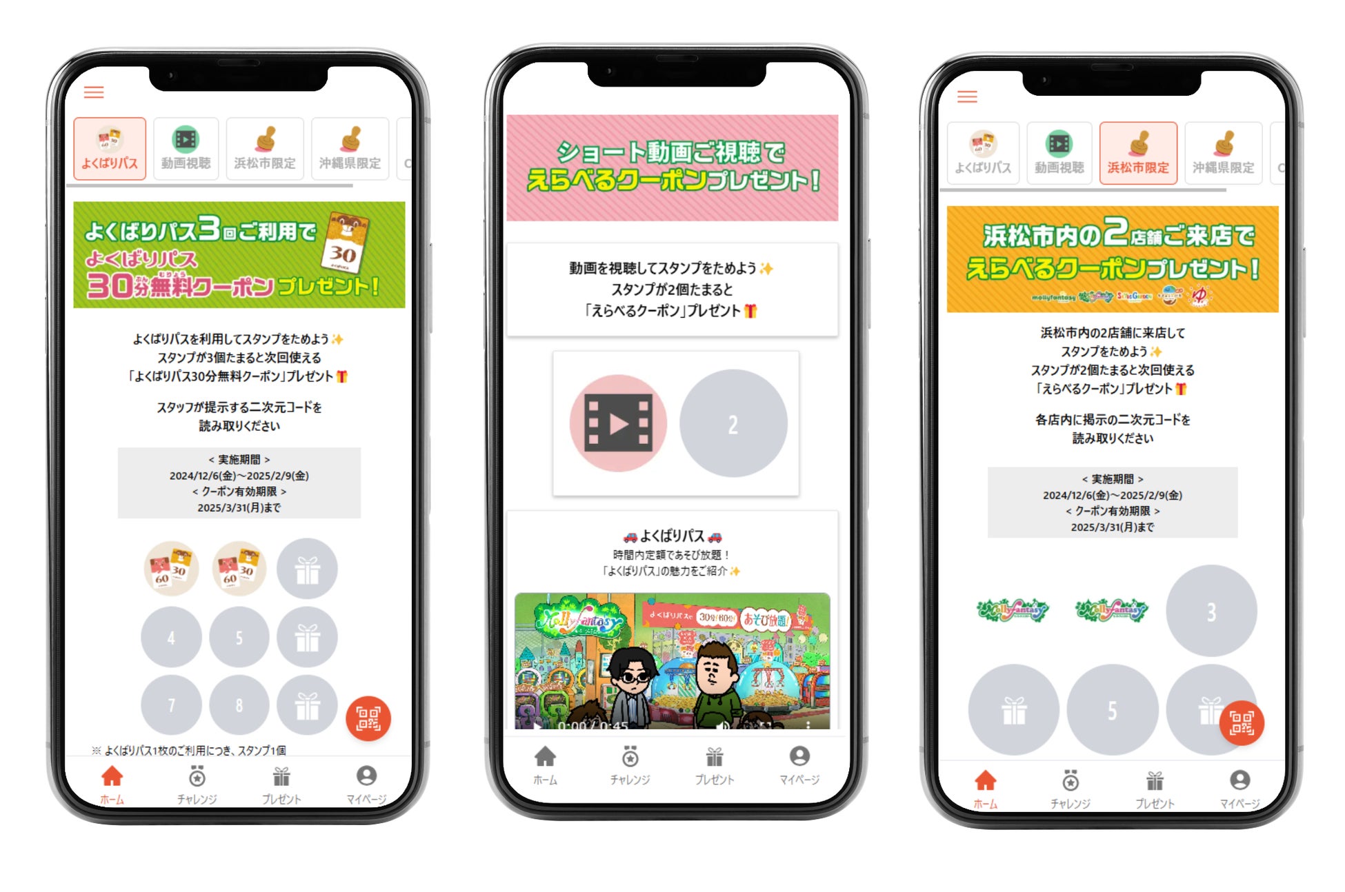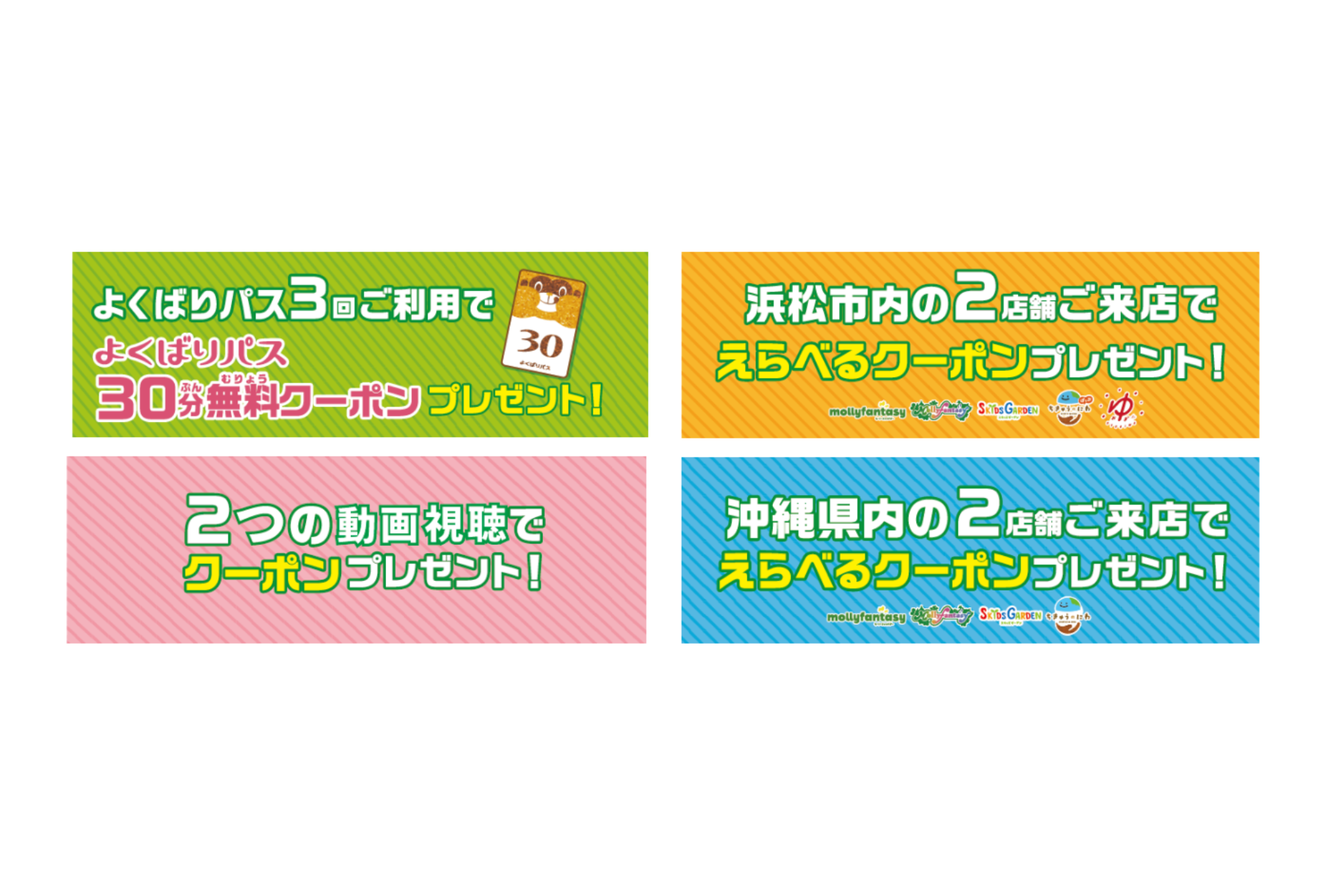 全国のアミューズメント施設「モーリーファンタジー」「モーリーファンタジーf」「PALO」で利用できる時間内定額でゲームがあそび放題になる『よくばりパス』を利用し、スタンプ獲得!スタンプが3個たまると次回使える『よくばりパス』30分無料クーポンをプレゼントします。
