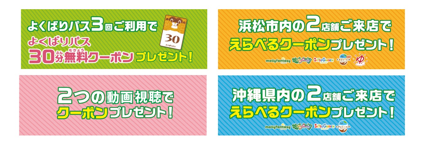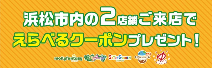 対象店舗:モーリーファンタジー 浜松市野店、スキッズガーデン浜松市野店、モーリーファンタジー 浜松西店、モーリーファンタジー 浜松志都呂店、スキッズガーデン浜松志都呂店、ちきゅうのにわ‟ぽっぷ” そよら浜松西伊場店、OYUGIWA 浜松市野
