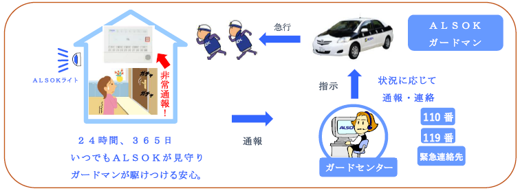 ALSOKのホームセキュリティは全国125万件以上のお客さまにお選びいただいています。ALSOKの最大の特長は「駆けつけのスピード」。システムが異常を検知すると、即座にあらゆる隊員の現在地を常時把握しているガードセンターに通報が飛び、もっとも早く到着できるガードマンを瞬時に割り出して指令を出す最新のシステムを導入しています。全国に広がる約2,400カ所のガードマン待機所を有する、50年の歴史を持つ警備のリーディングカンパニー。そして30年以上の間ホームセキュリティを販売してきた確かな実績と高度なノウハウ。ALSOKだからこそご提供できる安心があります。