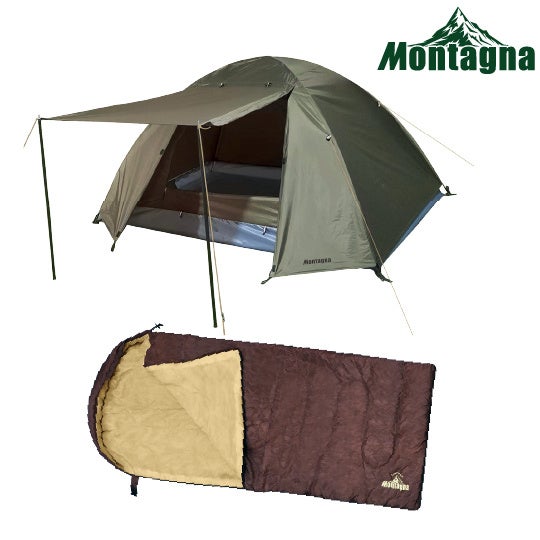 Montagna高性能テント&シュラフのセット。 耐水圧3000mmフライシート付きのダブルウォールテントと 春夏シーズンに快適なシュラフの豪華アイテム2種をチョイス。 快適なソロキャンプを応援。