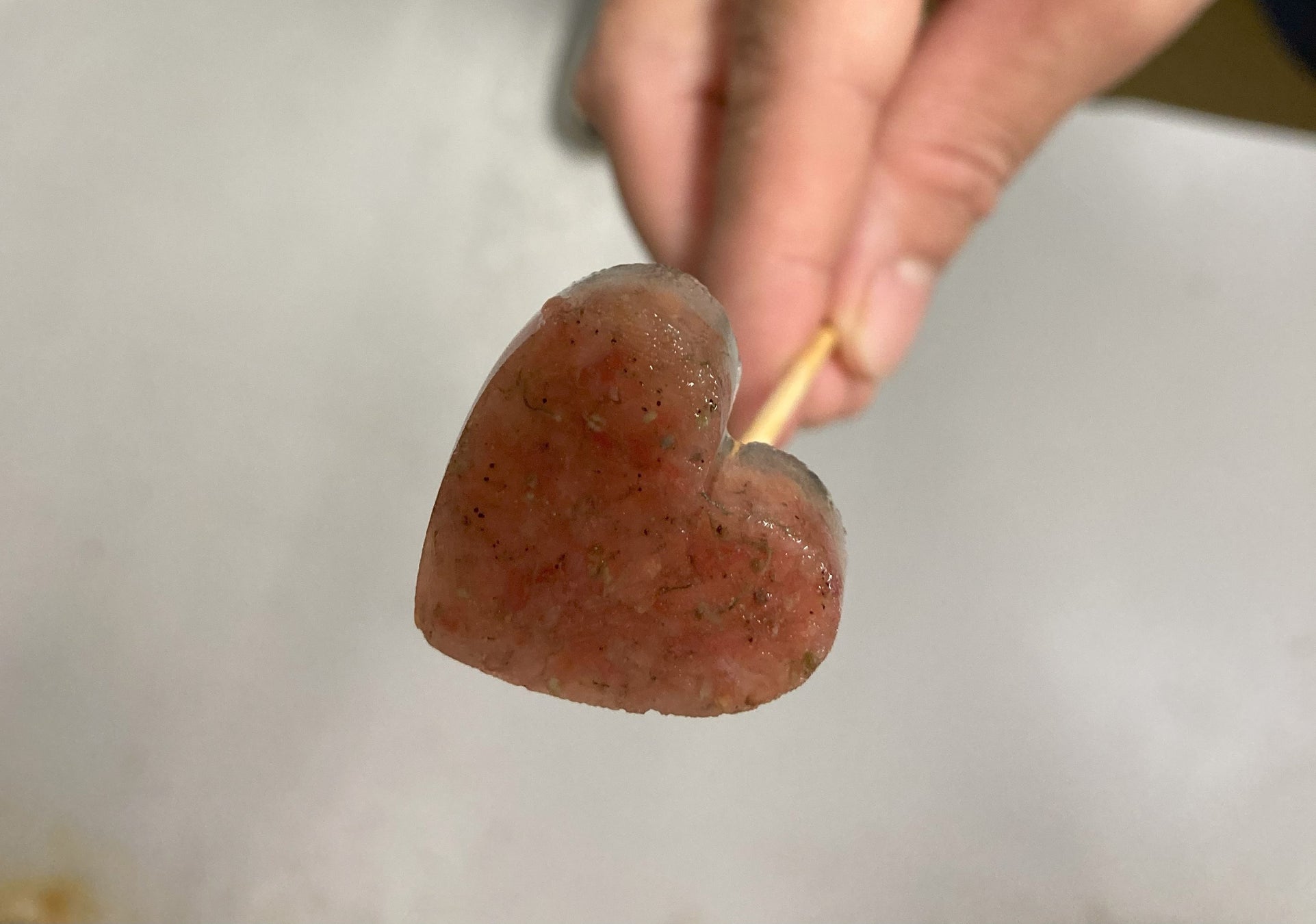 本企画では、飼育員が作った特製のエサを魚に直接あげていただきます。特製のエサは普段エサとして与えているオキアミや赤虫をハートや星など様々な型で凍らせて作りました。従来のエサやり体験とは一味違ったエサやりになっており、直接エサをあげることで魚たちが食い付く勢いや迫力をお楽しみください。