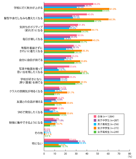 さらに、制服のデザインが学校生活に与える影響としては、「学校に行く気分が上がる」(46.0%)、「髪型や身だしなみも整えたくなる」(40.0%)、「気持ちがポジティブ(前向き)になる」(31.8%)、「毎日が楽しくなる」(30.5%)が上位となり、特に女子生徒でこの傾向が強く見られ、制服の存在が生徒の心理面や行動に大きな影響を与えていることが明らかになりました。