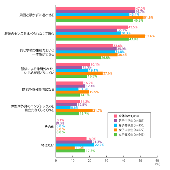 制服を着ることによる安心感としては、全体では「周囲と浮かずに過ごせる」(47.0%)や「服装のセンスを比べられなくて済む」(42.5%)、「同じ学校の生徒だという一体感ができる」(33.6%)といった、周囲との関係性に関する項目が高い割合を占めています。