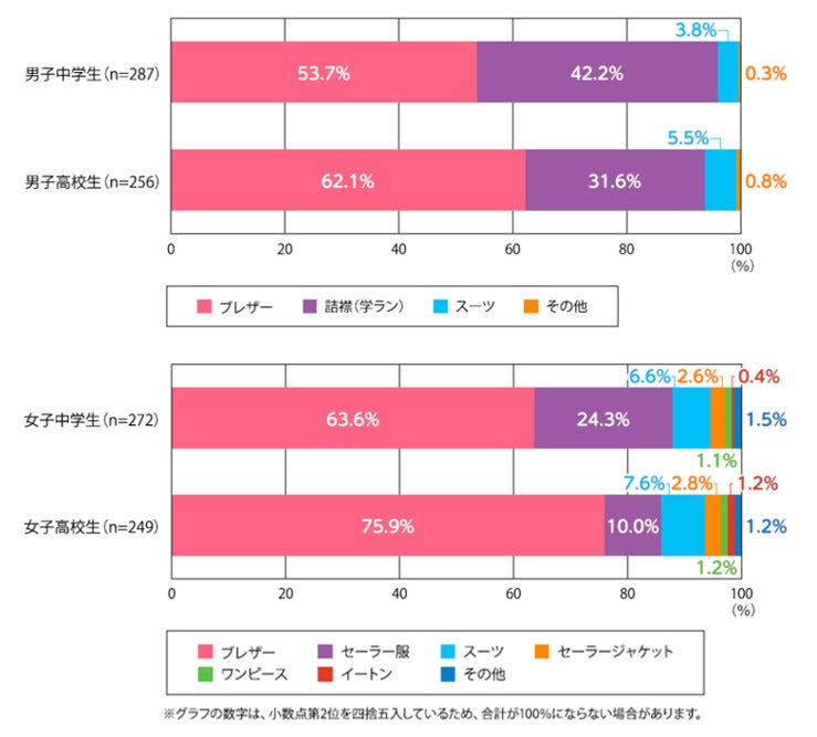 今回、全国の中学・高校生1,064人を対象にした調査では、着用制服のタイプは「ブレザー」(男子中学生53.7%、男子高校生62.1%、女子中学生63.6%、女子高校生75.9%)が多くなり、「詰襟(学ラン)」や「セーラー服」の着用率を大きく超えていました。