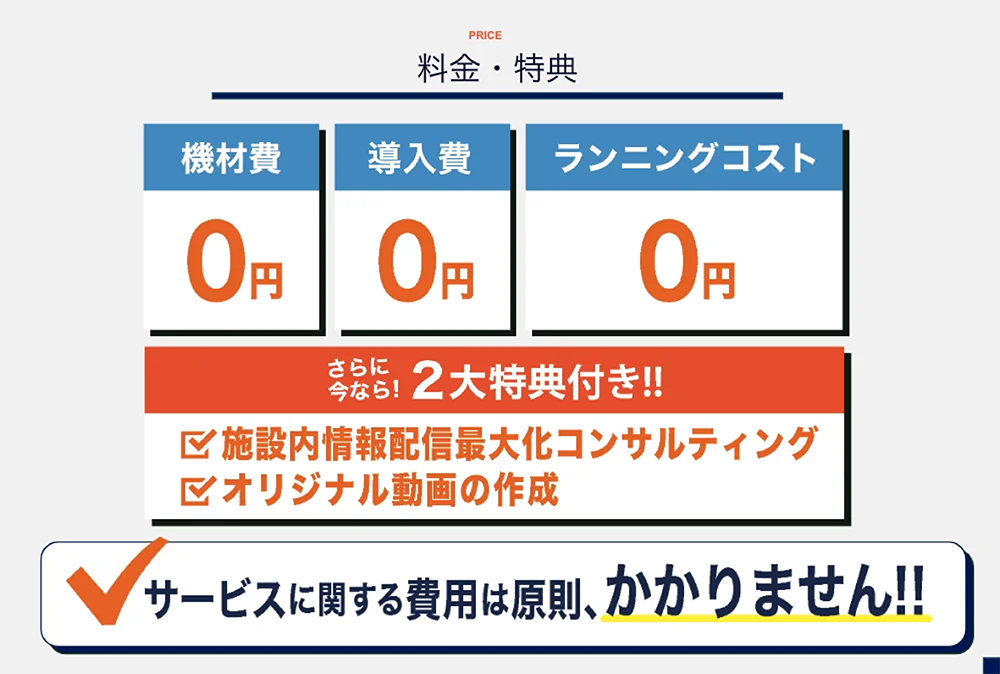 さらに今なら、機材費・設置費・ランニングコスト全て無料に加え、施設内情報配信最大化コンサルティングとオリジナル動画作成の2大特典付きでご提供いたします