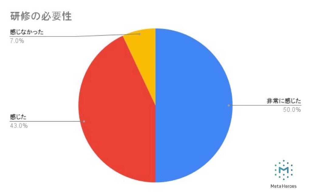 参加者のうち、93%(「非常に感じた」50%、「感じた」43%)が、社員のAIリテラシー向上のための研修が必要であると回答しました。これは、AIツールの進化に対し、企業内での人材育成が急務である現状を反映していると言えます。