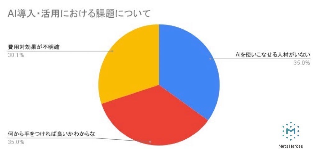 最も多かった課題は、「AIを使いこなせる人材がいない」と「何から手をつければ良いかわからない」で、どちらも35%を占めました。具体策や導入へのロードマップが不明確な企業が多いことが浮き彫りになりました。
