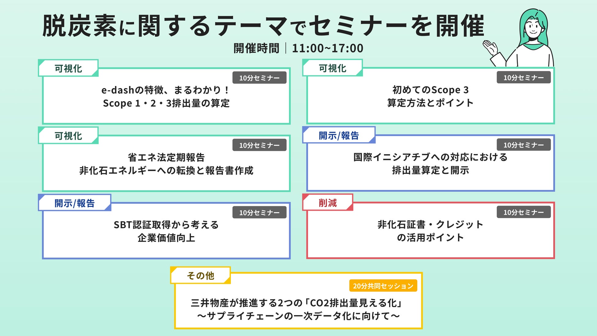 CO2排出量の可視化・開示 / 報告・削減に関するお役立ち情報を10分間のミニセミナーでお届けします。