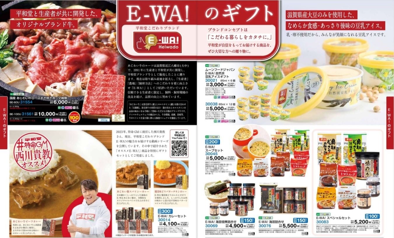 今年の冬ギフトカタログ掲載商品は、「平和堂こだわりブランドE-WA!」の品揃え・取り扱いを大きく増やしました。なかでも、今秋発売の「E-WA! 自然派豆乳アイス」は、滋賀県産大豆100%使用の豆乳で作ったプレミアムアイスで、乳・卵を使っていないのでアレルギーをお持ちの方でも安心してお召し上がりいただけます。ほかにも、「平和堂こだわりブランド E-WA!」の人気商品を詰め合わせた「E-WA!スペシャルセット」などのギフトもご用意していますので、是非ご覧ください。
