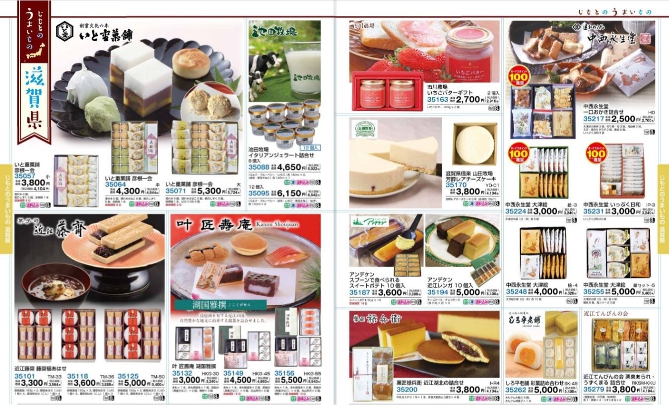 また、「おうちで楽しむごちそうギフト」と題して、「栗」「お芋」をテーマに、お子様からご年配の方まで幅広く好まれるやさしい甘さのお取り寄せスイーツを取り揃えました。平和堂が出店している2府7県の名品・名産を厳選し、「じもとのうまいもの」として集めました。滋賀県からはあゆの店きむらの湖魚の佃煮や徳志満の近江牛ひとくち餃子、京都府からは京漬物の老舗とり市老舗、愛知県からは山本屋総本家の生みそ煮込うどん、富山県からは海津屋の氷見うどんなど、バラエティ豊かに取り揃えています。