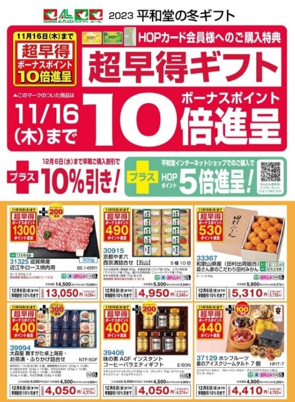 そして、「平和堂HOPカード」「エールマインカード」会員様にはご購入特典をご用意しました。11月16日(木)までの期間限定として、ボーナスポイント10倍進呈となる超早得ギフトをご用意したほか、12月6日(水)までの早期ご購入特典として、カタログ掲載商品全品本体価格より10%割引サービスを実施します。さらに一部の商品は、通常のHOPポイントに加え、100~500HOPポイントを進呈いたします。