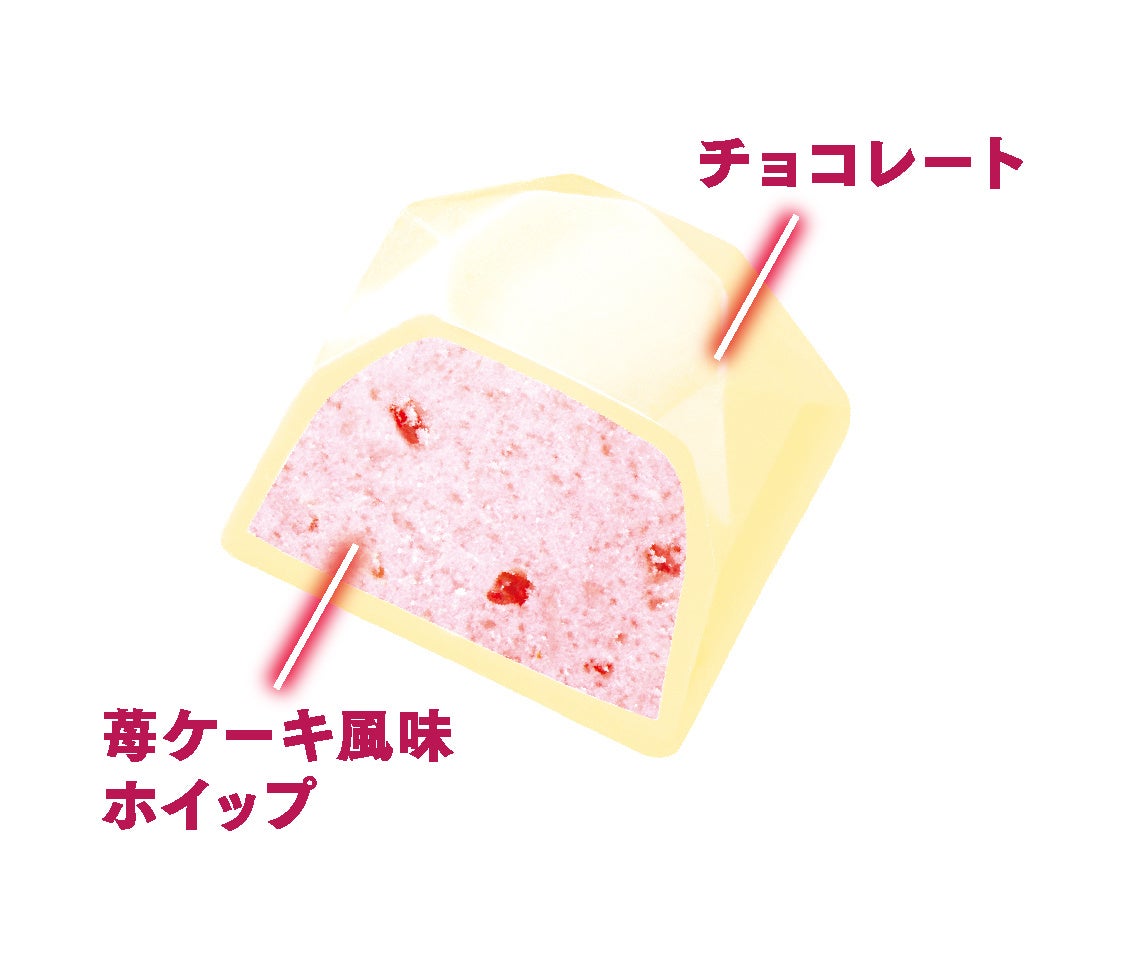 ・苺果肉入りのケーキ風味ホイップを白いチョコレートで包んだ、苺の甘酸っぱい味わいを楽しめる