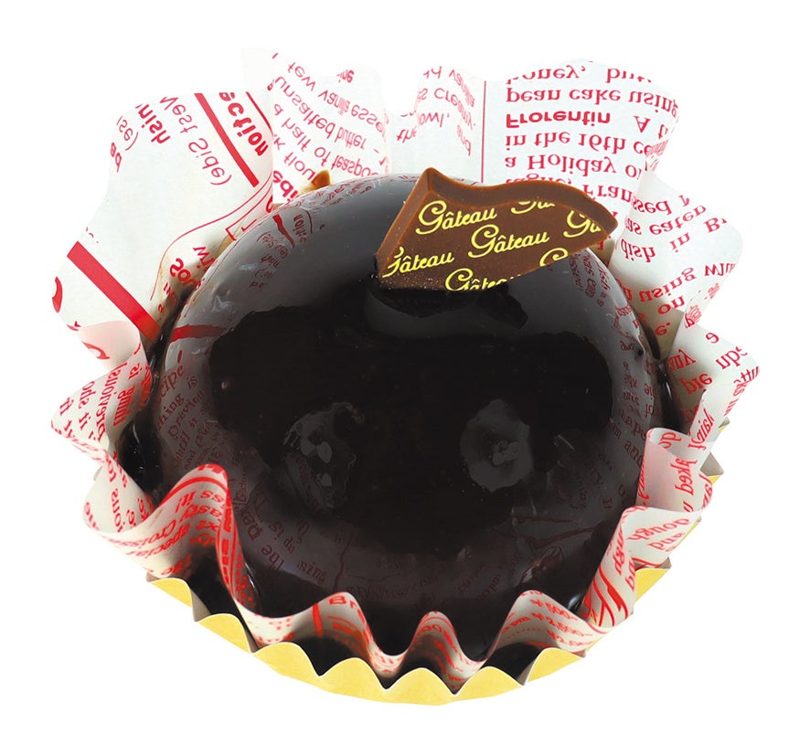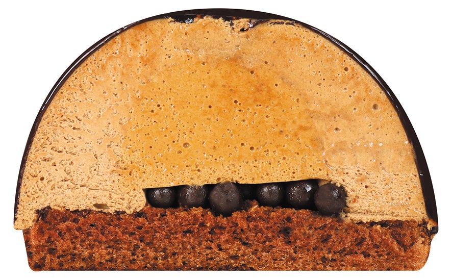 ココアスポンジとチョコレートムース、アーモンドムースを重ねドーム形を作り、食感のアクセントにシリアルチョコをしのばせ、艶やかなチョコグラサージュで仕上げました。濃厚なチョコレートの味わいが楽しめるケーキです。