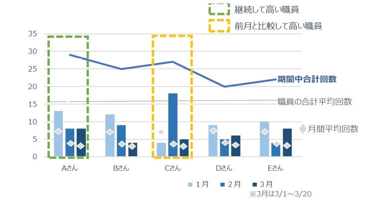 高い職員(自己申告とデバイス計測にギャップのある職員)を確認できた。