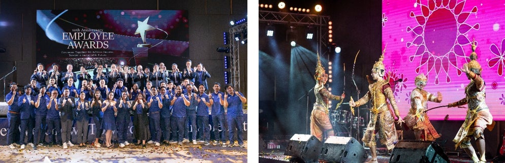 祝賀パーティ冒頭では勤続10年の従業員表彰も行われ、タイ伝統のパフォーマンスが披露される盛大なイベントとなりました。OB・OGも参加し、従業員が再会を喜ぶ姿も見られ、明るく風通しの良い社風を感じられるひと時を過ごすことができました。