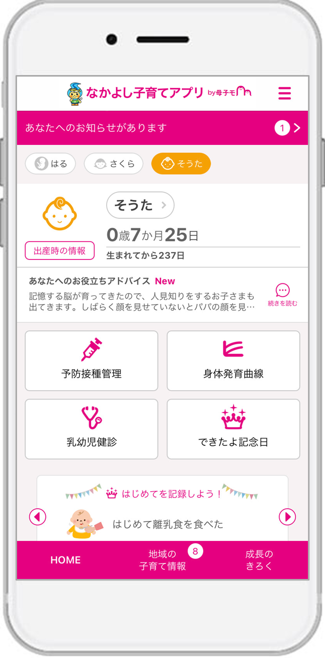 栃木県那珂川町に採用された『なかよし子育てアプリ』は、スマートフォン・タブレット端末・PCに対応したサービスで、妊産婦と子どもの健康データの記録・管理や予防接種のスケジュール管理、出産・育児に関するアドバイスの提供、離れた地域に住む祖父母など家族との共有機能や、町が配信する地域の情報をお知らせするなど、育児や仕事に忙しい母親や父親を助けてくれる便利な機能が充実しています。