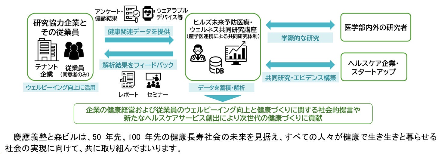 学校法人慶應義塾(東京都港区、塾長:伊藤公平)と森ビル株式会社(東京都港区、代表取締役社長:辻󠄀 慎吾)は、2021年4月に開設した「慶應義塾大学医学部ヒルズ未来予防医療・ウェルネス共同研究講座(特任教授:岸本泰士郎)」の一環として、「働く人の心身の健康やウェルビーイングに資するデータベース構築(以下「本研究」)」を開始しました。
