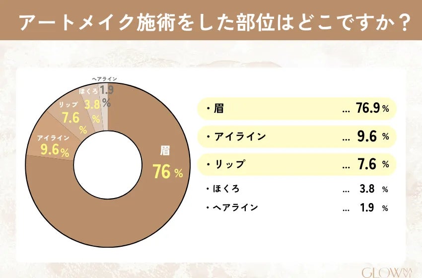 アンケートの結果、76.9%が「眉」のアートメイクを受けており、顔の印象を左右するため人気が高いことがわかりました。アイライン(9.6%)、リップ(7.6%)も人気があり、セットメニューの需要も高まっています。