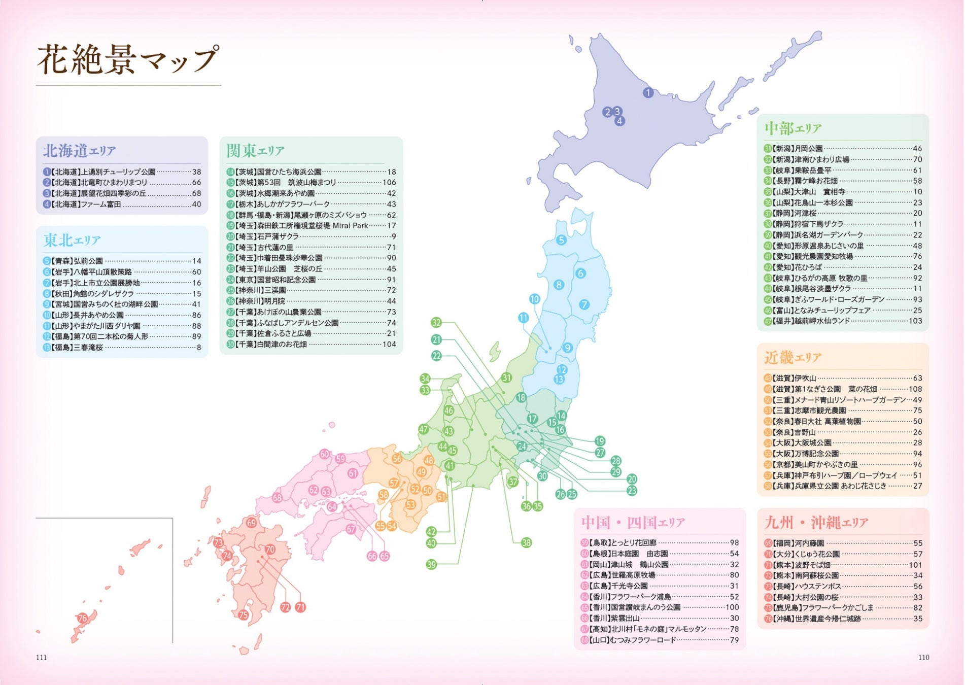 季節を春、初夏、夏、秋に分け、北海道から沖縄まで全国の花の絶景スポットを、美しい写真とともにまとめました。