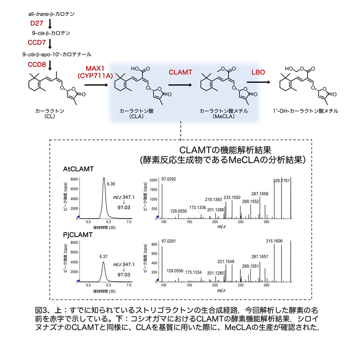 本研究グループは、すでに一般的な植物で見つかっている、SLの生合成酵素のアミノ酸配列をもとに、根寄生雑草であるコシオガマとヤセウツボの遺伝子情報から、相同性が高い遺伝子を探索しました。ヤセウツボに関しては、これまで全ゲノムに関する情報は報告されていませんでしたが、独自にヤセウツボのゲノム解読も行い、新しく見出されたゲノム情報からの探索を行いました。一般的な植物においては、ストリゴラクトンの生合成において、D27, CCD7, CCD8, CYP711A, CLAMT, LBOと名付けられた酵素がはたらくことが知られています(図2)。そこで、これらの配列をもとに、ヤセウツボとコシオガマのゲノム情報よりホモログを探索したところ、いずれに関しても相同性の高い遺伝子配列が存在することが明らかになりました。そこで、これらの遺伝子産物について、個別にその機能を調べる実験を行いました。その結果、いずれの酵素についても、一般的な植物で知られていたのと同じ機能を有することが明らかになりました。図3ではその中でも、植物ホルモンとして活性型構造の一つであることが知られているカーラクトン酸メチル(MeCLA)の生成を触媒するCLAMTの酵素試験結果を示しています。さらに、コシオガマの植物体抽出物から、SL類の検出を試みたところ、重要な生合成中間体であるカーラクトンを検出することに成功しました。また、上記の通り、SLは一般的な植物においては植物ホルモンとして機能することが知られており、その際には、D14と名付けられたタンパク質が、SLの受容体として機能します。根寄生雑草においても、生産されるSLは植物ホルモンとしてその形態形成を制御する役割を担っていることが推測されます。そこで、研究グループは、コシオガマのD14遺伝子についても機能解析を行いました。コシオガマでは、遺伝学的に遺伝子を欠損させる技術が確立していないため、研究グループはモデル植物であるシロイヌナズナのD14遺伝子欠損変異体に対して、コシオガマのD14遺伝子を形質転換により導入しました。得られた組み換え植物においては、d14変異体で見られていた枝分かれ過剰な形質は回復し、コシオガマのD14がシロイヌナズナ内において、SLの受容体として機能したことが示されました。