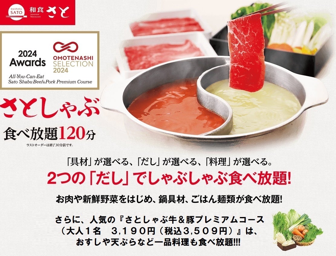 国内197店舗を展開する「和食さと」全店で販売している、人気の食べ放題メニュー「さとしゃぶ食べ放題 牛&豚プレミアムコース」が、このたび『OMOTENASHI Selection(おもてなしセレクション)2024』にて対象商品として見事受賞しました!!!