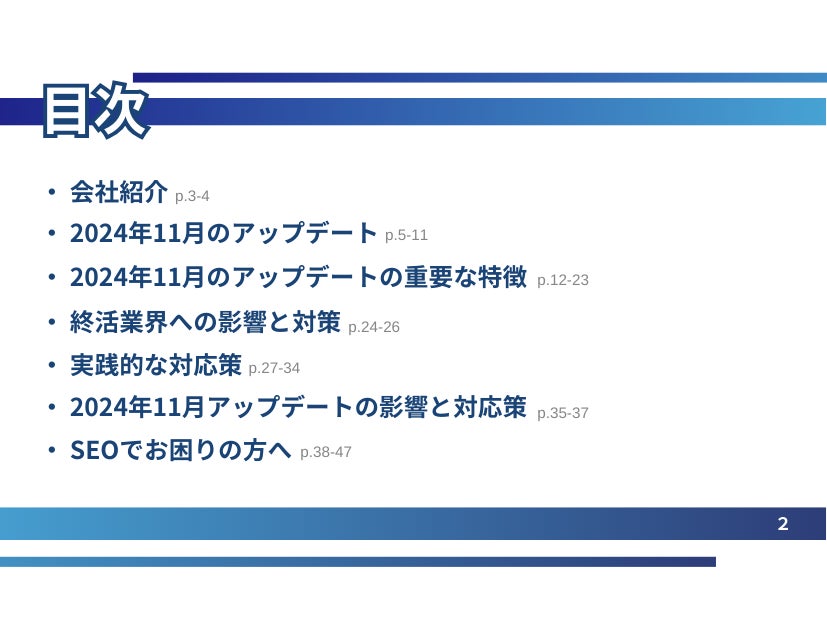 2024年11月のGoogleコアアルゴリズムアップデートは、多くの業界に大きな影響を与えています。特に終活業界においては、検索結果での上位表示を実現するために従来のSEO手法を見直し、新たに効果的な対策を講じることが求められています。単なる情報提供では評価されず、訪問者の役に立つ高品質で詳細な情報や、視覚的な要素を取り入れたコンテンツがより重要です。本レポートでは、終活業界が検索順位を向上させ、持続的な競争力を保つために実践すべき対応策について解説しています。