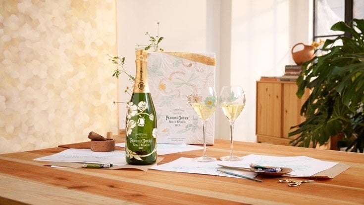 ボックスデザイン:ペリエ ジュエの象徴であるアネモネの花々の上に、ブドウ畑に共生する虫や昆虫たちがまるでダンスをしているかのように「受粉」の瞬間を美しく紡いだデザイン。同梱のグラス2脚もコラボレーション仕様のリミテッドエディション