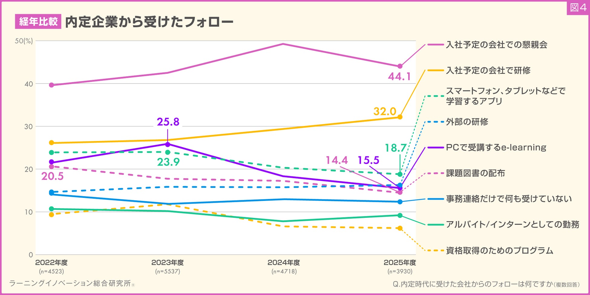 内定期間中、内定企業から受けたフォロー、「懇親会」が4年連続1位。2位の「研修」は3年連続増加(図4)