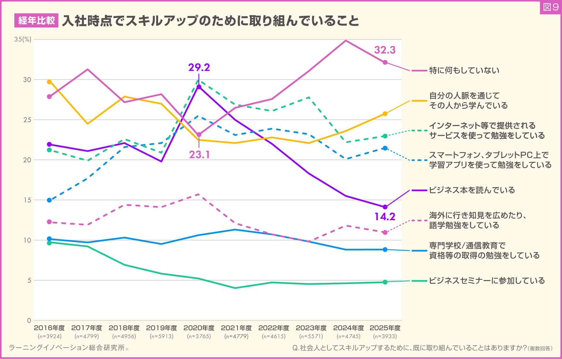 入社時点でスキルアップのために取り組んでいること、 2020年度を境に「何もしていない」が増加。「ビジネス本を読む」は急激に減少(図9)