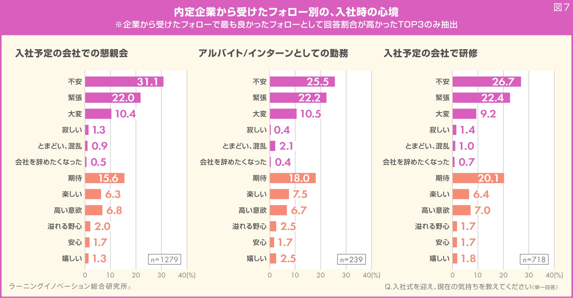 結果、回答に大きな差は見られないものの、「入社予定の会社での懇親会」を経験した新入社員は、他項目よりも「不安」の割合が高くなりました。また、「入社予定の会社で研修」を経験した新入社員は、他項目よりも「期待」の割合が高い結果となりました(図7)。