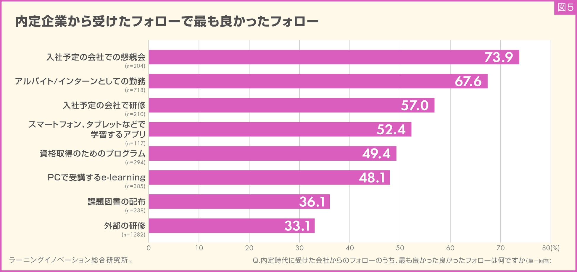 結果、「入社予定の会社での懇親会」のフォローを受けた新入社員のうち、73.9%が最も良かったと回答し、その割合は最大となりました。次に「アルバイト/インターンとしての勤務」(67.6%)、「入社予定の会社で研修」(57.0%)と続きました。社内の人と交流できるフォローに対する満足度が高いことがわかりました(図5)。