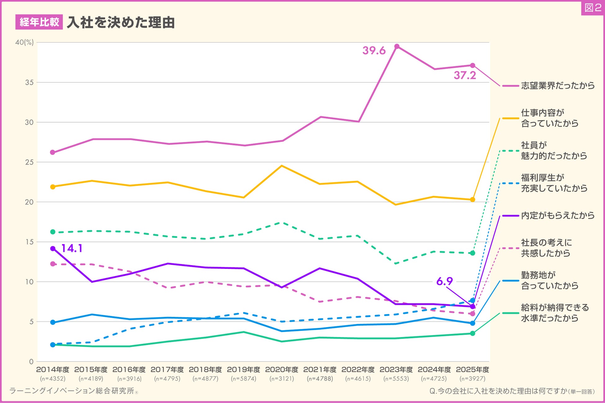 一方、「内定がもらえたから」の割合は2014年度では14.1%だったところ、徐々に減少し、2025年度では6.9%と1割を割る結果となりました(図2)。