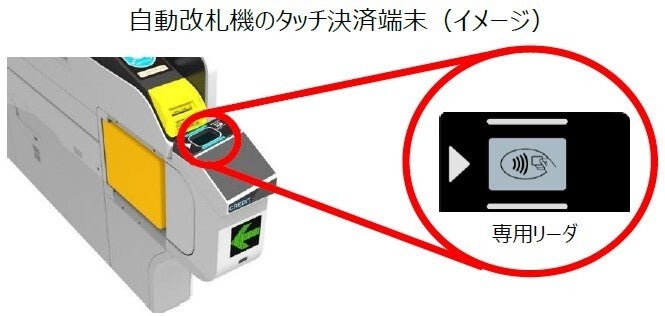 お手持ちのタッチ決済対応のカード(クレジット・デビット・プリペイド)や、同カードが設定されたスマートフォン等を、自動改札機に新たに設置する専用リーダ(※)にタッチすることで、そのまま改札を通過しご乗車いただけます。