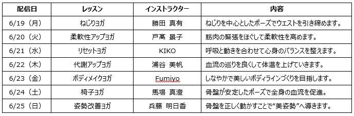 イベントは6月19日(月)~6月25日(日)の1週間、日替わりでご用意した15分間の目的別ヨガレッスンと、この期間中にライブでおこなうオンラインフィットネス「トルチャ」のヨガレッスンすべて、合計約20本を無料で配信します。目的別ヨガは、柔軟性アップ、代謝アップ、姿勢改善、椅子ヨガなど、ヨガになじみのない方でも気軽に参加でき、日常生活にも取り込みやすいラインナップをそろえました。スキマ時間にスッキリしたい方、フィットネスクラブやヨガスタジオでヨガを受けるのはまだ不安、という方にもおすすめです。