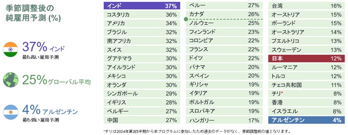 純雇用予測は、42カ国・地域のうち全ての国・地域がプラスと回答しています。日本の雇用意欲は、前四半期比±0ポイントとなり、堅調な結果となりました。