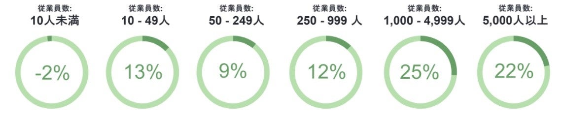 日本国内の組織規模別調査では、従業員数10人未満を除く、5つの組織規模で増員予定となっています。最も高いのは、従業員数1,000-4,999人の組織で、前四半期比±0ポイントの純雇用予測+25%でした。