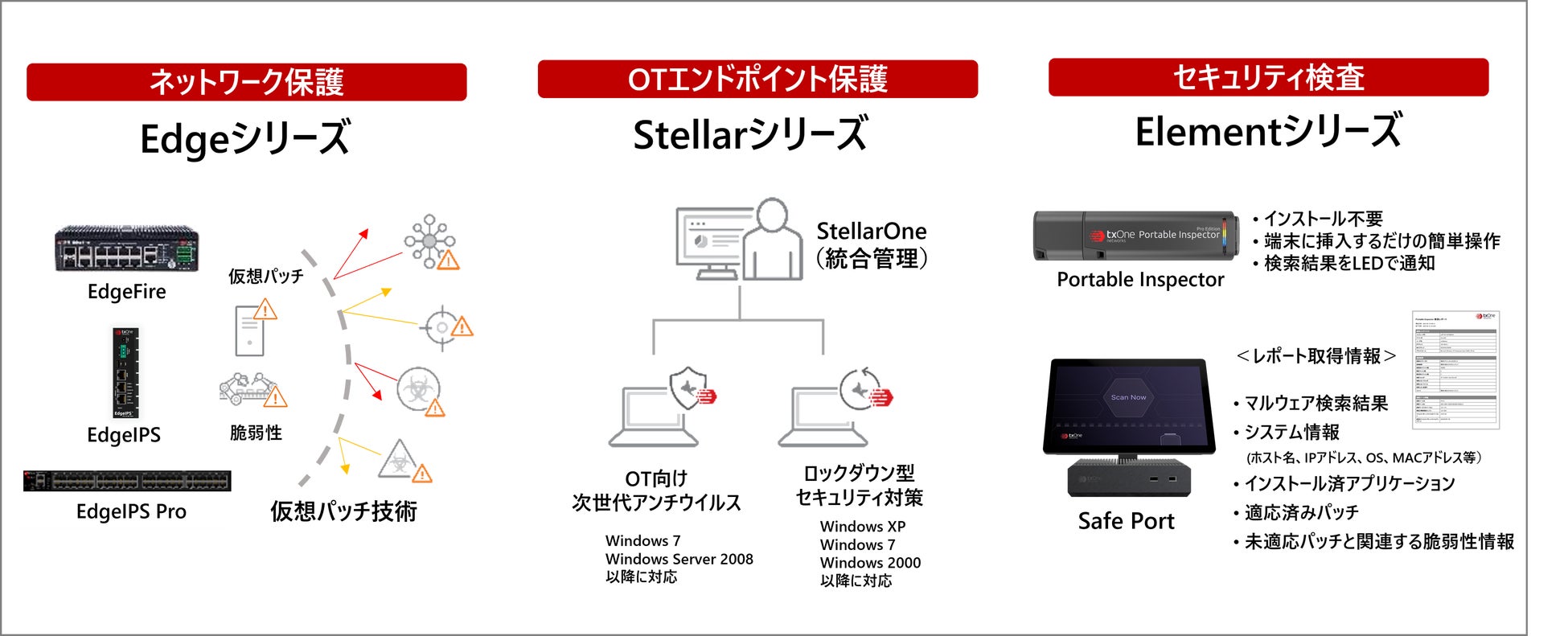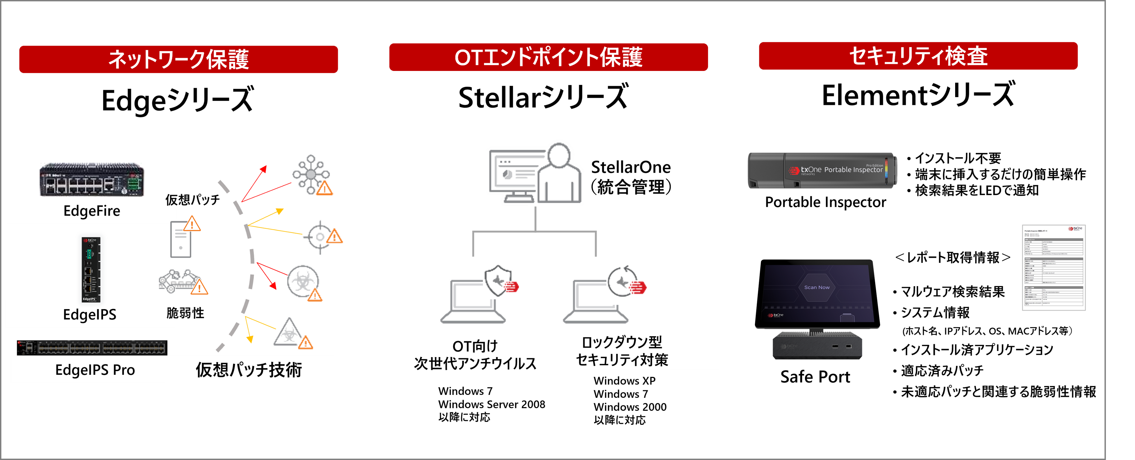 「Portable Inspector」「Safe Port」「ElementOne」の3つの製品によって構成され、工場などのクローズド環境下のセキュリティ検査と資産管理業務を効率化する製品です。
