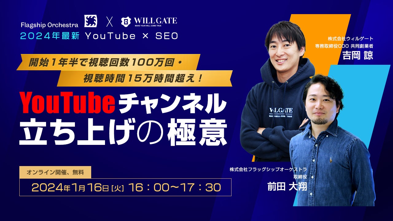 株式会社ウィルゲート(本社:東京都港区、代表取締役CEO:小島 梨揮、以下「ウィルゲート」)は、株式会社フラッグシップオーケストラ(本社:東京都港区、代表取締役:大澤 穂高)と合同で、『【2024年最新YouTube×SEO】開始1年半で視聴回数100万回・視聴時間15万時間超え!YouTubeチャンネル立ち上げの極意』をテーマにしたオンラインセミナーを1月16日(火)に開催いたします。(申込み先:https://bit.ly/3RSphw1 )